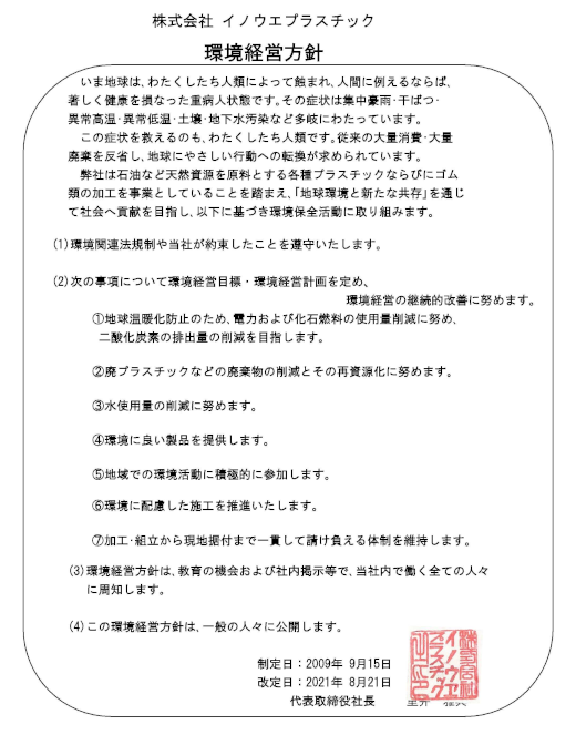 株式会社イノウエプラスチックはスタッフ全員が一体となって、環境の維持・保全と環境負荷低減活動(以下「環境保全活動」と言う。)を推進します。
